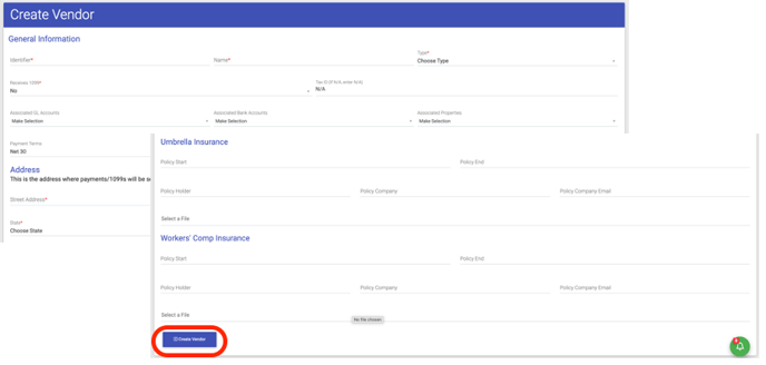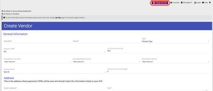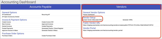 - On the right under Vendors, click Create Vendor (Manually/CSV).