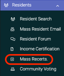 Step 1. Navigate to the Residents tab under the Main Menu, click Mass Recerts.
