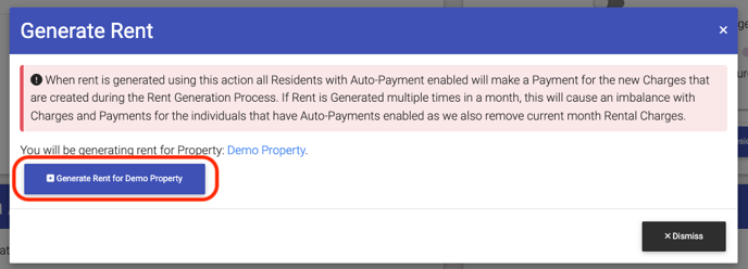 - When rent is generated using this action all Residents with Auto-Payment enabled will make a Payment for the new Charges that are created during the Rent Generation Process. If Rent is Generated multiple times in a month, this will cause an imbalance with Charges and Payments for the individuals that have Auto-Payments enabled as we also remove current month Rental Charges.