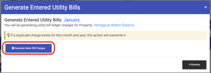 - Choose to generate utility bills, i.e. Water Bill Charges, for the selected property.